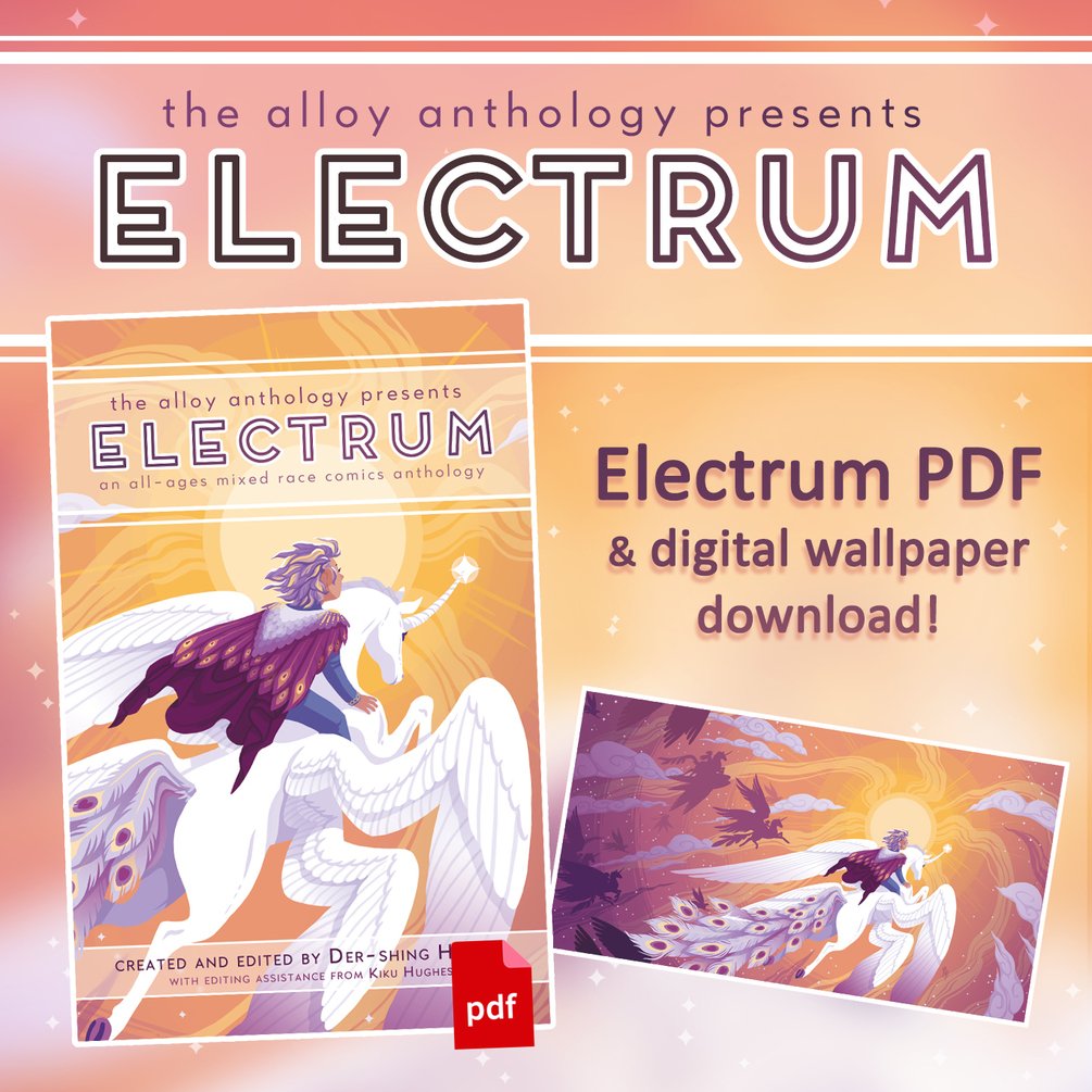 Your purchase includes a digital download of ELECTRUM, a mixed-race comics anthology edited by Der-shing Helmer and Kiku Hughes. Upon purchase you'll be able to download the complete PDF edition of the book. This DRM-free PDF includes all 272-pages of the anthology in striking thematic colors.