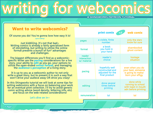 Writing for webcomics is a lot different than writing for other types of comics! The visual format, update frequency, pacing, and many other factors are much different than the average print-reading experience. How can we work around and with the dynamic nature of online publishing to create a successful online comic?